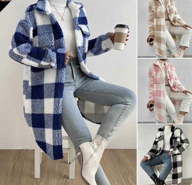 + 2 moreWomen Long Plaid Fleece Turn Down Collar Long Sleeve Button Down Loose Flurry X-Long Coat