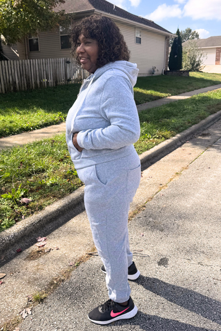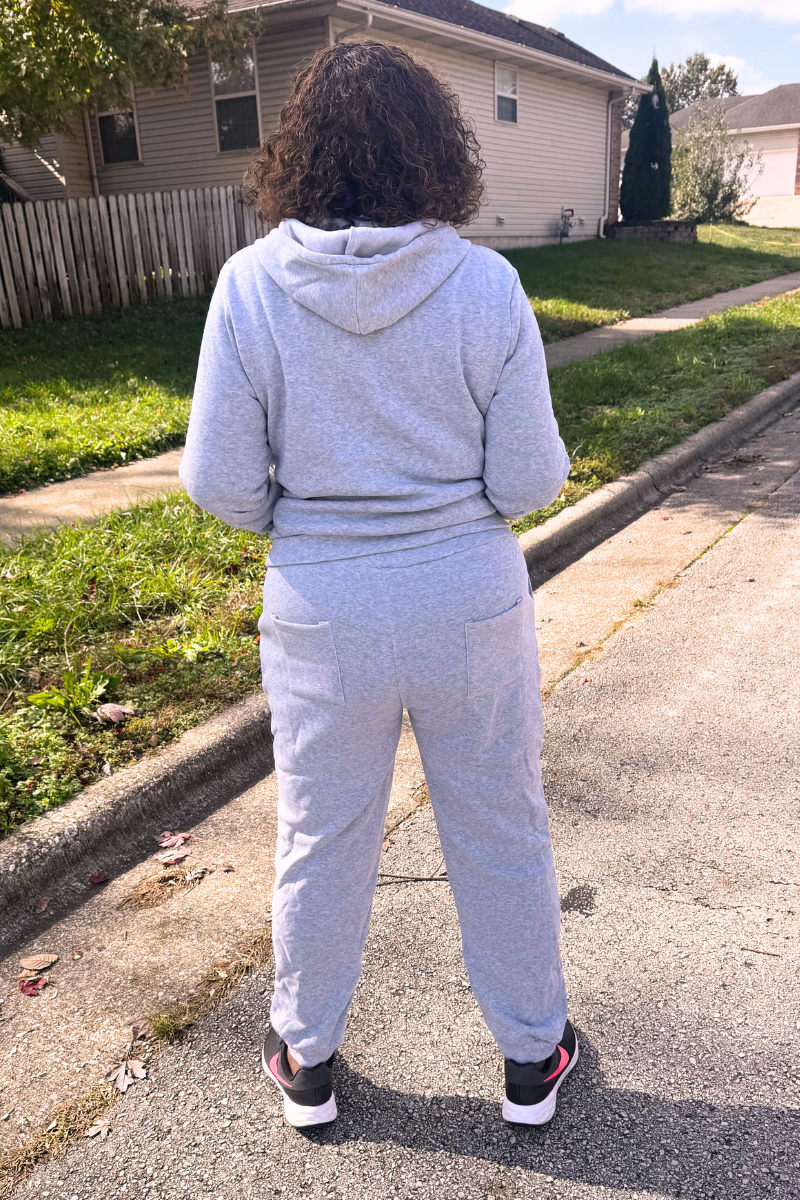 Elevate your casual wardrobe with this sophisticated two-piece grey sweatsuit, designed for those who refuse to compromise on style or comfort. The coordinated set features a perfectly proportioned hoodie and matching sweatpants crafted from premium fabric that delivers softness without sacrificing durability. The neutral grey tone pairs effortlessly with any aesthetic, making it a versatile staple for lounging, running errands, or casual outings. Quality construction ensures this set maintains its shape and color through countless wears, while the relaxed fit provides unrestricted movement throughout your day.