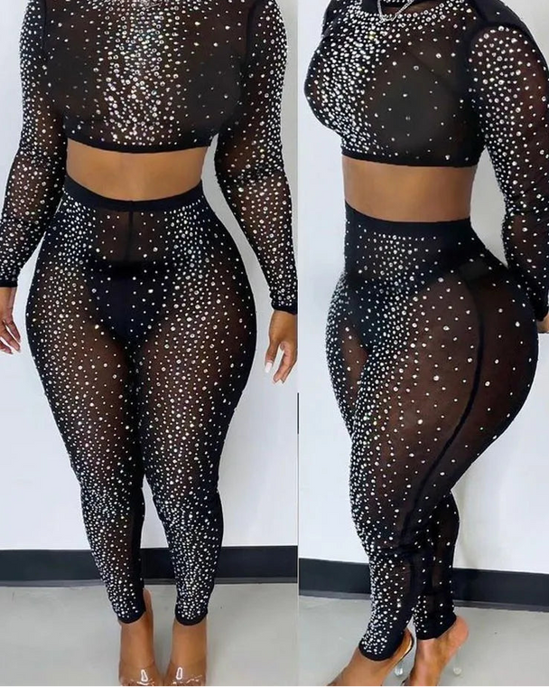 Rhinestone Sheer Mesh Crop Top and See Through Pants 2pcs Set