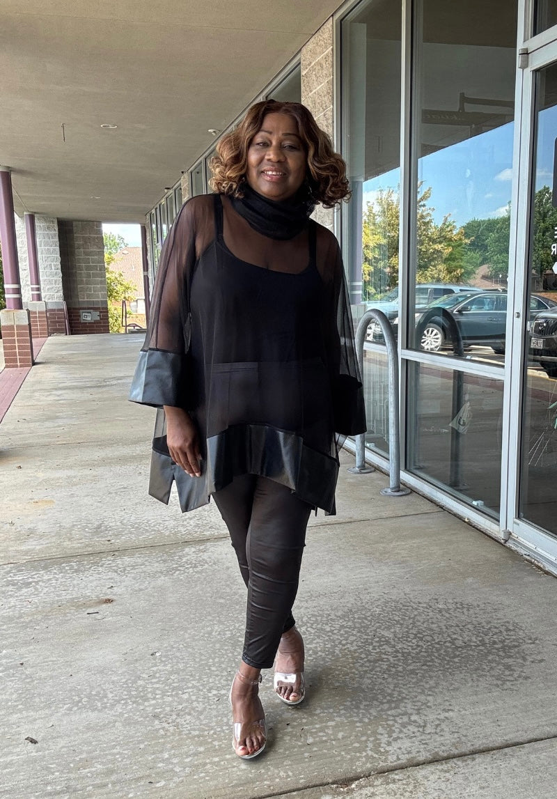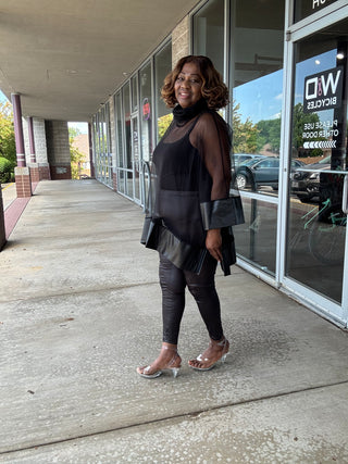 This sheer mesh casual top features delicate transparency combined with sleek leather trim, offering a refined balance of edgy and elegant style. Its lightweight fabric ensures breathability and comfort, while the leather accents provide structure and a modern finish, making it a versatile piece for sophisticated layering or standout casual wear.